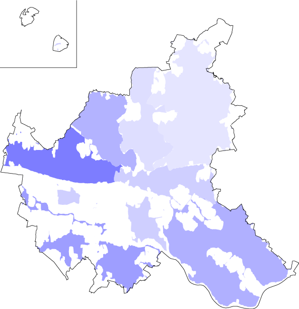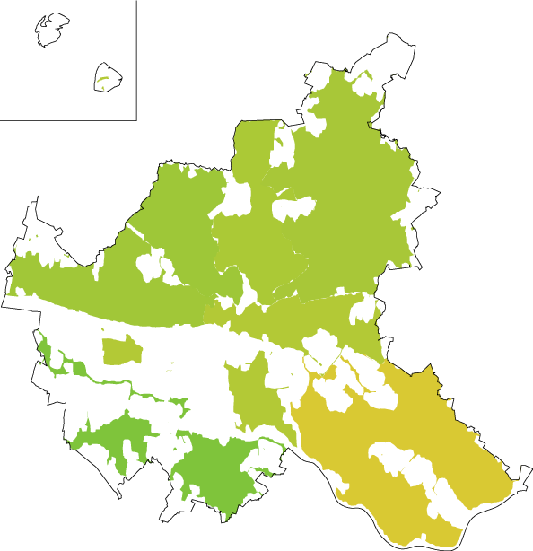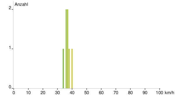 Legende: ≤30 km/h 35 km/h 40 km/h 45 km/h 50 km/h 55 km/h ≥60 km/h unbewohntes Gebiet Berechnung nicht möglich