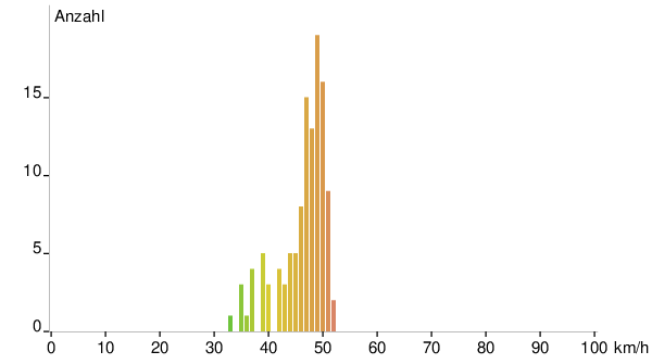 Legende: ≤30 km/h 35 km/h 40 km/h 45 km/h 50 km/h 55 km/h ≥60 km/h unbewohntes Gebiet Berechnung nicht möglich